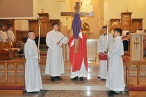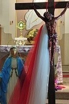 Kolejną częścią wielkopiątkowego nabożeństwa jest adoracja krzyża. Do świątyni wnosi się przykryty krzyż z wizerunkiem umęczonego Chrystusa.